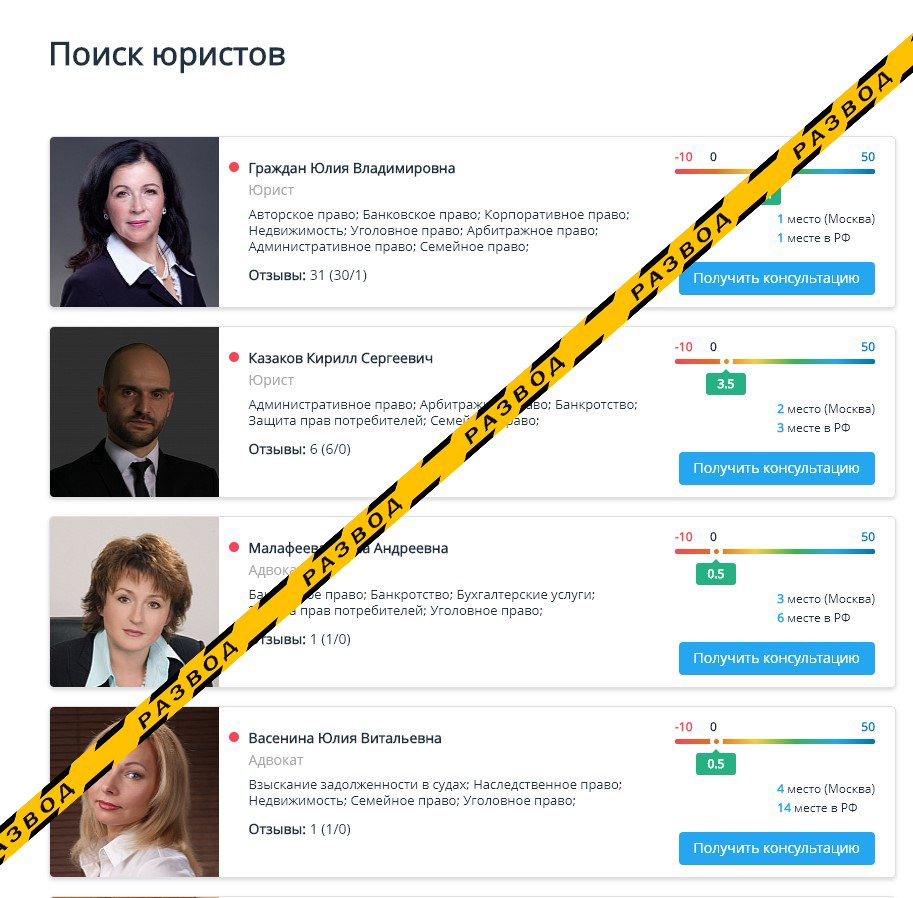 Еще один распространенный прием аферистов, которым пользуется legal-ship. Бесплатный сыр только в мышеловке. На бесплатной консультации, как правило самый неопытный юрист льет в уши воду. Обещая, что все проблемы будут решены, если человек обратиться в их контору. Закупоривая диалог непонятные для обычного человека юридическими терминами.