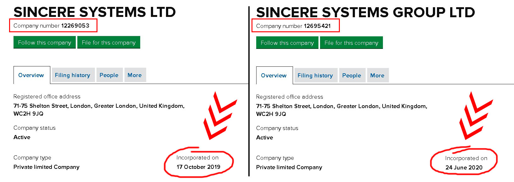 Начнём с того, что на сайте указано юридическое лицо Sincere Systems Ltd, которое зарегистрировано 17 октября 2019 под номером 12269053. А вот в футере сайта указана совершенно другая компания Sincere Systems Ltd с номером 12695421 и зарегистрированная 24 июня 2020 года. Налицо явная попытка ввести пользователей в заблуждение.