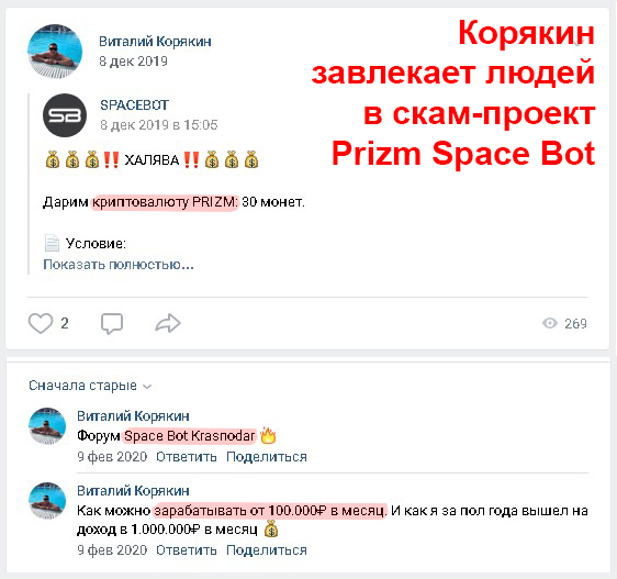 Один из организаторов этого цирка для нуждающихся Корякин Виталий. Пару месяцев назад он завлекал людей в лохотрон Prizm Space Bot и впаривал токен Prizm, обещая прибыль от 100 000 рублей в месяц. Вы наверняка догадались, что никакой криптовалюты Prizm не существует. Ни продать, ни обменять Prizm на реальные деньги невозможно. Сейчас по аналогичной схеме Корякин продвигает новый скам-проект AssetG.Finance.
