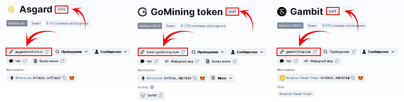 Убедиться в этом просто. Достаточно зайти на любой из сайтов, которые отслеживают курс, капитализацию и объемы торгов криптовалюты и задать в поиске ASG или GMT. Сразу видно, что токен ASG полное наименование ASGARD ссылается на официальный сайт asgardecofund.io.