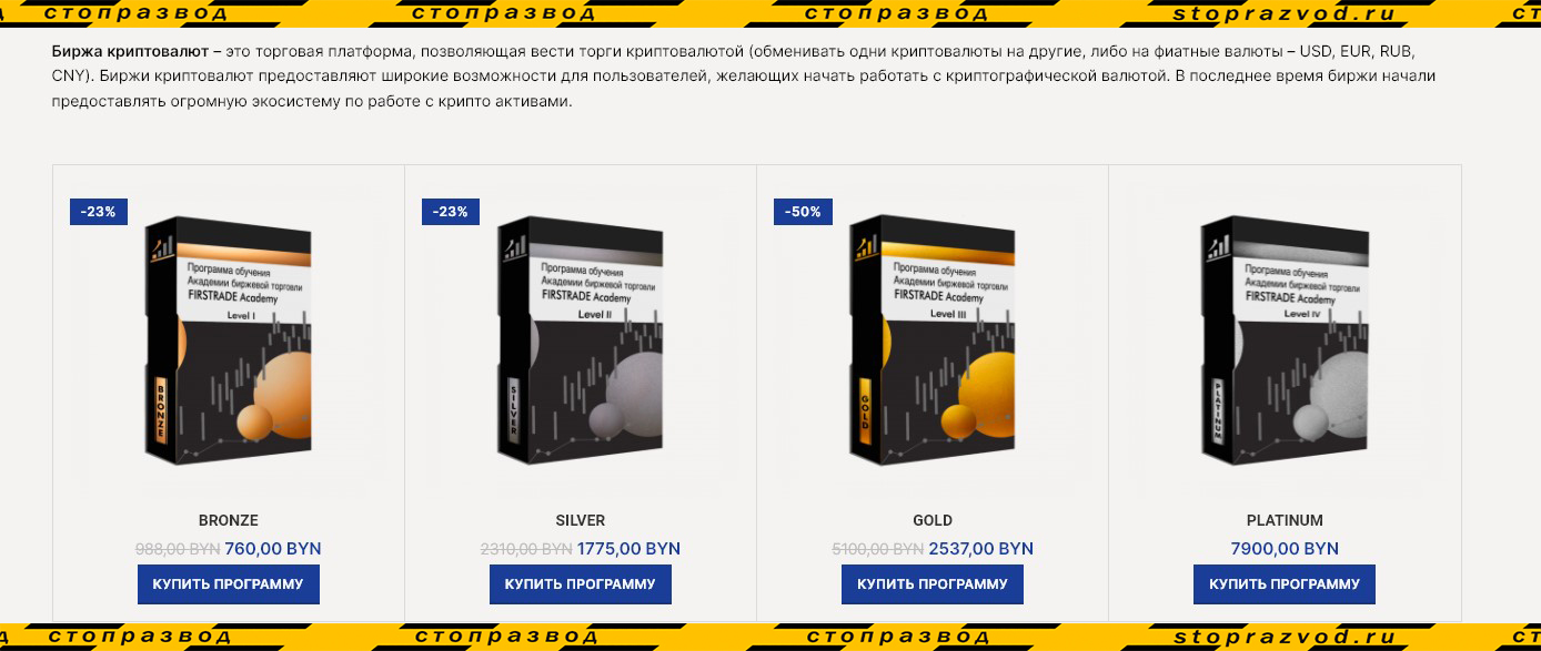Интересный момент, маркетологи из Firstrade Academy решили не только навариться на чужих знаниях, но и сделать это 4 раза. Компания предлагает обучение по торговле на – Форекс, криптовалютах, фондовых рынках MOEX и NYSE. Выбрали самые популярные темы скамов (включая пирамиду, но об этом позже) и продают для всех видов торговли одни и те же курсы. На одном и том же сайте! Наглость и бестолковость, достойная настоящих «профессионалов».