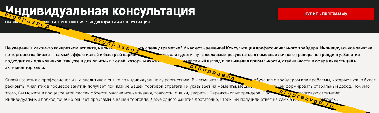 На индивидуальной консультации от Firstrade Academy, самый опытный и вероятно единственный трейдер академии проведет личную лекцию для клиента. Да, да именно лекцию. Ведь никаких практических успехов у трейдера за плечами нет, зато хорошо заучена теория. Поэтому за купленный час, «опытный эксперт» Firstrade Academy будет лить воду на уши. Рассказывая о том, как легко зарабатывать ни бирже, нужно только взять платное обучение. И все будет хорошо. Никаких практических занятий или реальных разборов трейдер провести не сможет.