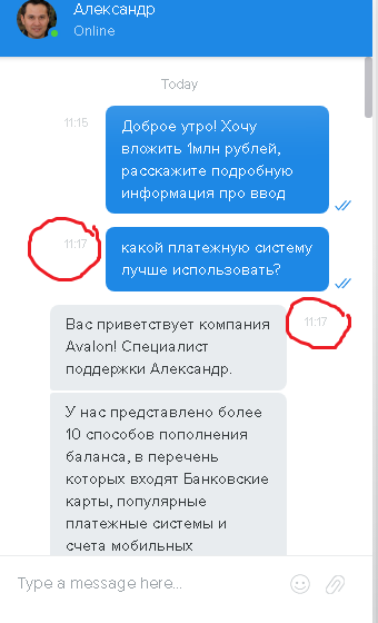 Добрый день, хочу поделиться опытом общения с поддержкой сайта Avalon. Изучил информацию в сети, захотел вложить сумму в 1 млн рублей. Прошел регистрацию, с этим все просто. Меня смущал только только один вопрос, кто основатель и руковидель данной организации.Тк с юр точки зрения это вполне законный и нормальный вопрос, когда ты решил инвестировать свои средства в проект, хотелось бы знать, кто за этим стоит. На все мои вопросы, менеджер скидывал ссылку с сайта Avalon, где висит 2 или 3 документа, якобы про регистрацию компании. НО, нигде нет четко прописаных лиц, кто основал и кто руководит/директор компании. При этом всем, поддержка стала очень долго отвечать на мои сообщения! Диалог в начале строился минута в минуту «спросил-ответили», далее, после вопроса про регистрацию компании и ее руководство время растянусь до 20 мин между сообщениями. Согласитесь, это очень настораживает и отталкивает вкладчика, когда вы хотите узнать самую элементарную информацию из разряда «Как зовут твою маму?» и получаете миллион отговорок. Диалог строился как-то так, если в краткой форме:
