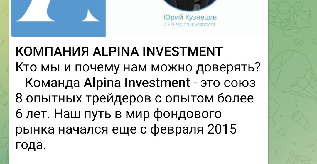 Осторожно! ALPINA INVESTMENT в телеграмм канале — мошенники! Опозиционируют себя как опытные трейдеры на бирже, продающие акции. Собирают инвестиции по нескольким тарифам, предлагают затем по ним выплаты, якобы с выигрыша на бирже. И небольшие суммы действительно переводят. Как только доходит до более крупных сумм, перестают отвечать в сообщениях! Я уже знаю 2-х пострадавших от этих мошенников. Один из менеджеров Дмитрий даже всем предлагает свой паспорт и видеочат, чтобы убедить что Вы ничем не рискуете. Но паспорт явно левый!..Если есть еще кто пострадавший от этих мошенников, пишите мне ватцап +79816982076