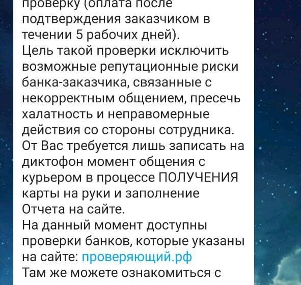 Звонят и предлагают подработать тайным покупателем, проверяя Магниты и банки. Говорят, что работают только с Росбанком и туда будут перечеслять оплату. Сами заказывают Вам карту. После того, как вы ее получаете, предлагают проверить Магнит и переводят на карту Росбанка 500 руб на контрольную закупку. Вы волняете проверку, заполняете отчет. Они обещают еще заплотить за саму проверку на днях. А пока предгают проверить банки, точнее работу офиса и курьера, оплата в среднем около 1000 руб за один банк. Дают Вам сслыку на сайт, через который вы оформляете заявки на карты. После проверки, говорят, что карты можно будет закрыть. Получаете карты, заполняете анкеты, они переводят по 50 руб на каждую карту и просят потратить эти деньги на оплату мобильной связи, это якобы для активации карты. После чего начинают кормить завтраками и обещают на днях оплатить все проверки.Но исчезают.