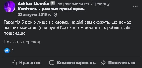 В отзывах о компании люди массово жалуются на халтурную работу со стороны ремонтников Капитель Львов. Призывая не связываться с этой конторой криворуких мастеров.