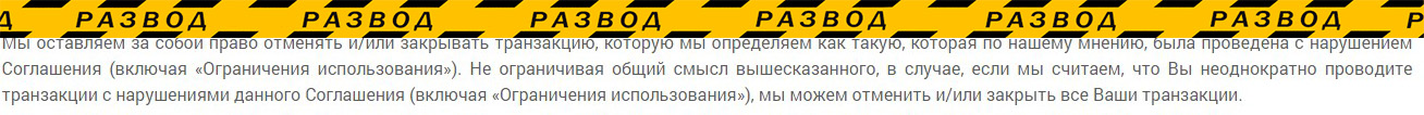 Все ваши транзакции могут быть остановлены и заморожены. Компания заявляет, что может это делать по своему усмотрению, а значит в любом случае она сможет в нужный момент не вывести деньги.