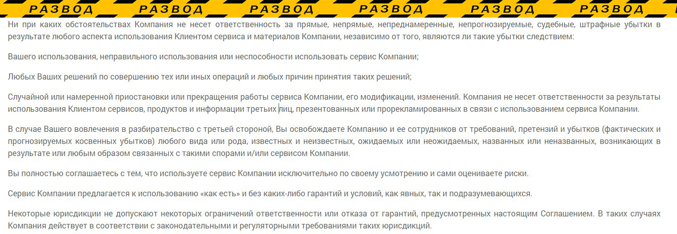 Здесь компания отказывается от какой-либо ответственности. Мошенник огородил себя от любых проблем.