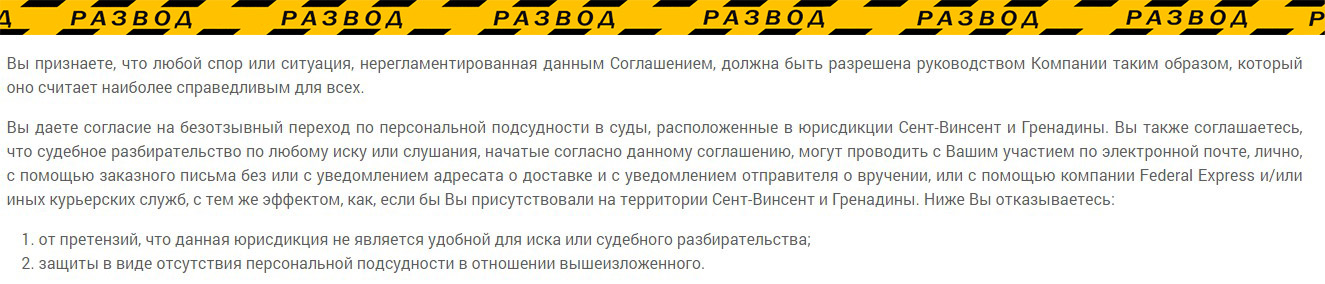 Как было указано брокер зарегистрирован в офшорах. Здесь указывает что вы согласны с тем что все судебные разбирательства, которые будут проходить по отношению к компании будут проходить на территории государства Сент-Винсент и Гренадины.