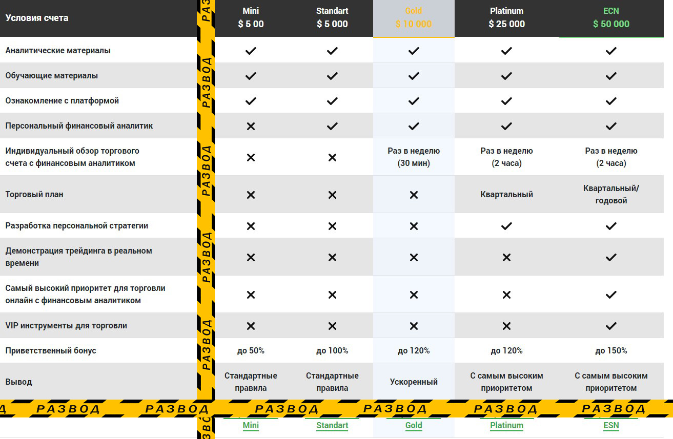 Finxpro наращивает к себе доверие высоким порогом входа относительно других брокеров. Имеет на выбор несколько типы счетов. Начиная от 500$, но этим не ограничивается. Finxpro также имеет более дорогие тарифные планы. Заплатив больше денег брокеру, вы не получите ничего кроме красивых обещаний богатства. Сотрудники названивают своим клиентам, и рассказывают мотивационные байки, стараясь выжать максимальный депозит со стороны клиента.