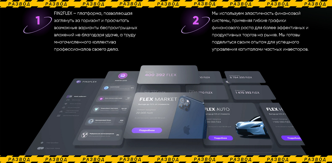 Хотя с последним мы все же ошибаемся — мудрёная карта, представленная на сайте, сообщает нам о неком фриланс-рынке, рынке ОТС, рынке стартапов… но потенциальный мамонт не должен задавать много вопросов. Поэтому мы листаем сайт ниже. А ниже нам открывается мотивация создателей(нет). Нас больше пытаются замотивировать вложить деньги в Fin2flex высокопарными фразами. И как всегда нам ни во что вникать не надо, эксперты все сделают за нас, а мы только наслаждаемся и получаем доход 1.2% в день. Сумма вложений на Fin2flex указана в неких FLEX. Что это и зачем оно нужно понять сложно, ибо нам никто и ничего не объясняет. И почему в имущественных программах (а тут оказывается можно купить тачку, хату, мобилу по дешевле), исходная цена написана в долларах США, а для вкладчика в этих самых FLEX? Вдруг их придется покупать за доллары (условно 1 к 3) и, например, Айфон уже не будет таким дешевым.
