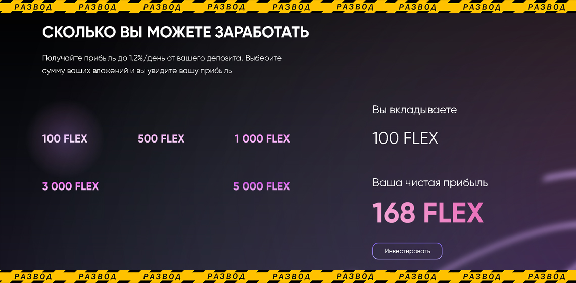 Хотя с последним мы все же ошибаемся — мудрёная карта, представленная на сайте, сообщает нам о неком фриланс-рынке, рынке ОТС, рынке стартапов… но потенциальный мамонт не должен задавать много вопросов. Поэтому мы листаем сайт ниже. А ниже нам открывается мотивация создателей(нет). Нас больше пытаются замотивировать вложить деньги в Fin2flex высокопарными фразами. И как всегда нам ни во что вникать не надо, эксперты все сделают за нас, а мы только наслаждаемся и получаем доход 1.2% в день. Сумма вложений на Fin2flex указана в неких FLEX. Что это и зачем оно нужно понять сложно, ибо нам никто и ничего не объясняет. И почему в имущественных программах (а тут оказывается можно купить тачку, хату, мобилу по дешевле), исходная цена написана в долларах США, а для вкладчика в этих самых FLEX? Вдруг их придется покупать за доллары (условно 1 к 3) и, например, Айфон уже не будет таким дешевым.