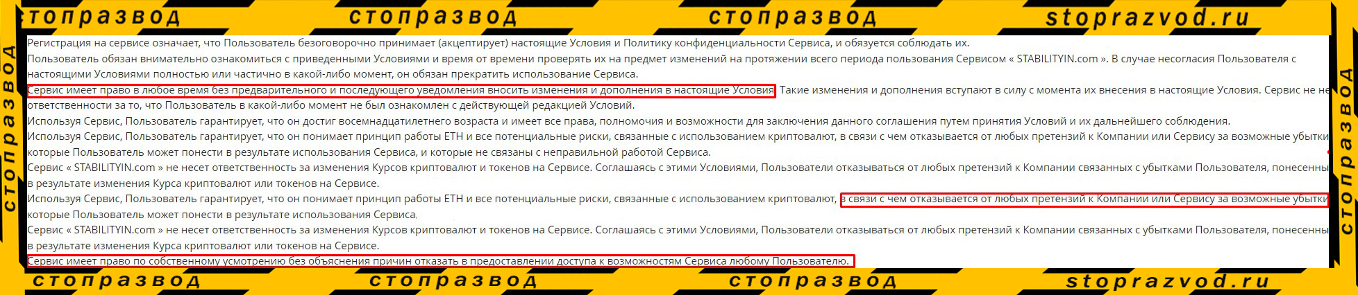 Чтобы убедится в том, что проект мошеннический, обратим внимание на их соглашение. Это подобие контракта содержит пункты максимально ограничивающие права пользователей.