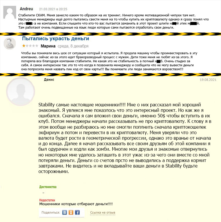 Огромное количество пользователей уже были обмануты данным проектом и потеряли там деньги и друзей. Отзывы рассказывают про то, как там люди теряли деньги семью и имущество. Менеджеры компании стабилити заставляют постоянно искать людей, которые будут нести деньги.
