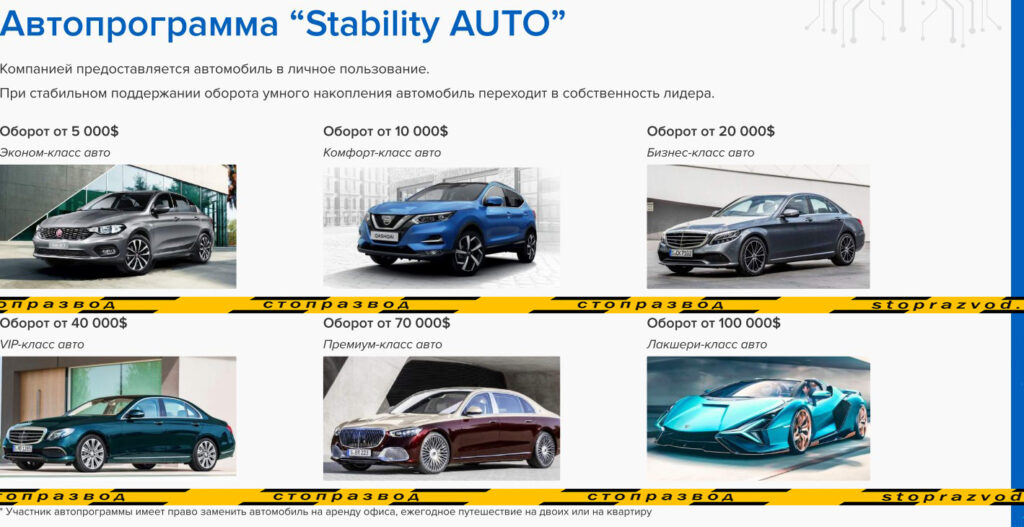 Проект Stability завлекает пользователей обещаниями красивой жизни. Обещает вам в подарок машины и дома. Гарантирует вам большие заработки.